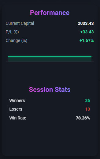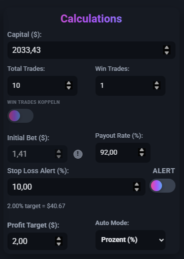 Home The Trading Calculator Join our Discord Accurate Trade Amount Calculation Performance Tracker Achieve your Goals User Friendly interface Meet Our Tool Performance Calculations Performance How it Works ENTER YOUR PAYOUT RATE + Stop LOSS INPUT YOUR CAPITAL INPUT YOUR WIN RATE INPUT YOUR DAILY GOAL Next, we calculate your trade amount and determine the number of sessions required to achieve your goal. Get the trading calculator Press Here